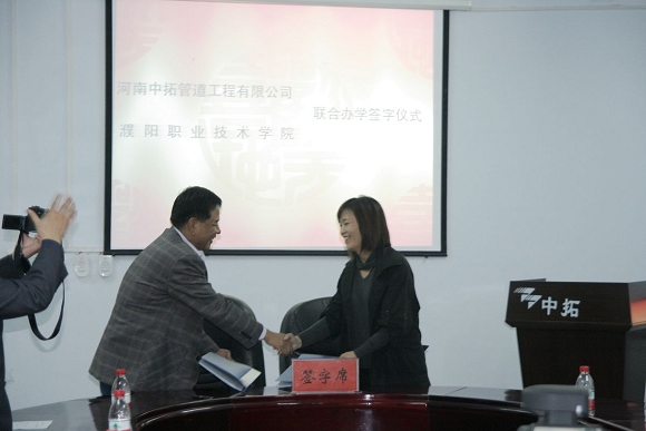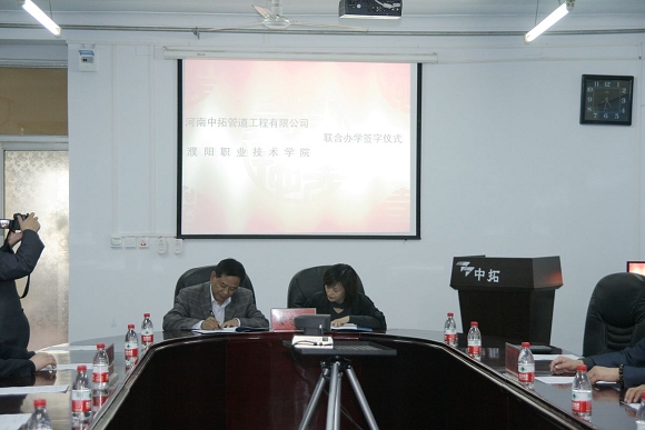 經(jīng)過(guò)前期周密細(xì)致的洽談準(zhǔn)備工作,河南中拓管道工程有限公司與濮陽(yáng)職業(yè)技術(shù)學(xué)院聯(lián)合辦學(xué)簽字儀式于2010年10月13日下午在公司二樓會(huì)議室隆重召開(kāi)。