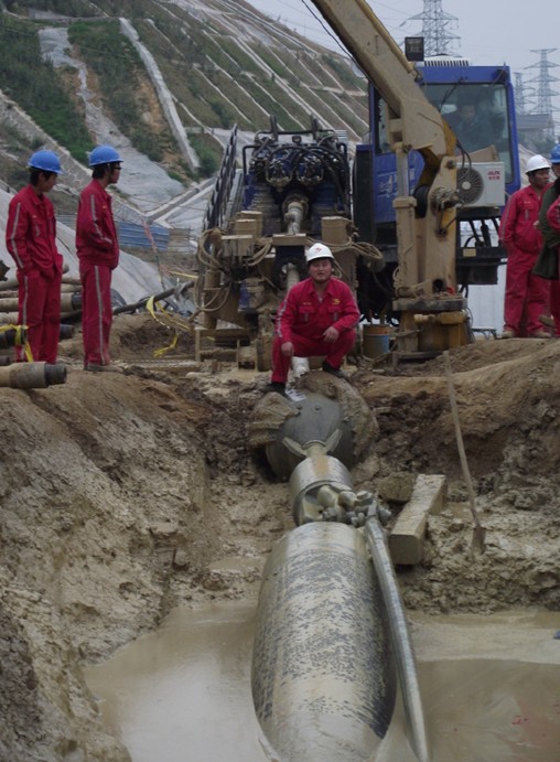 2011年3月18日中午13點(diǎn)11分,深圳平大路水平定向鉆工程Φ813管線穿越現(xiàn)場(chǎng)的一端管線在連續(xù)回拖33個(gè)小時(shí)之后終于露出了地面,至此,歷時(shí)5個(gè)月的深圳燃?xì)夤艿烙^瀾鎮(zhèn)太平山穿越項(xiàng)目宣告成功!