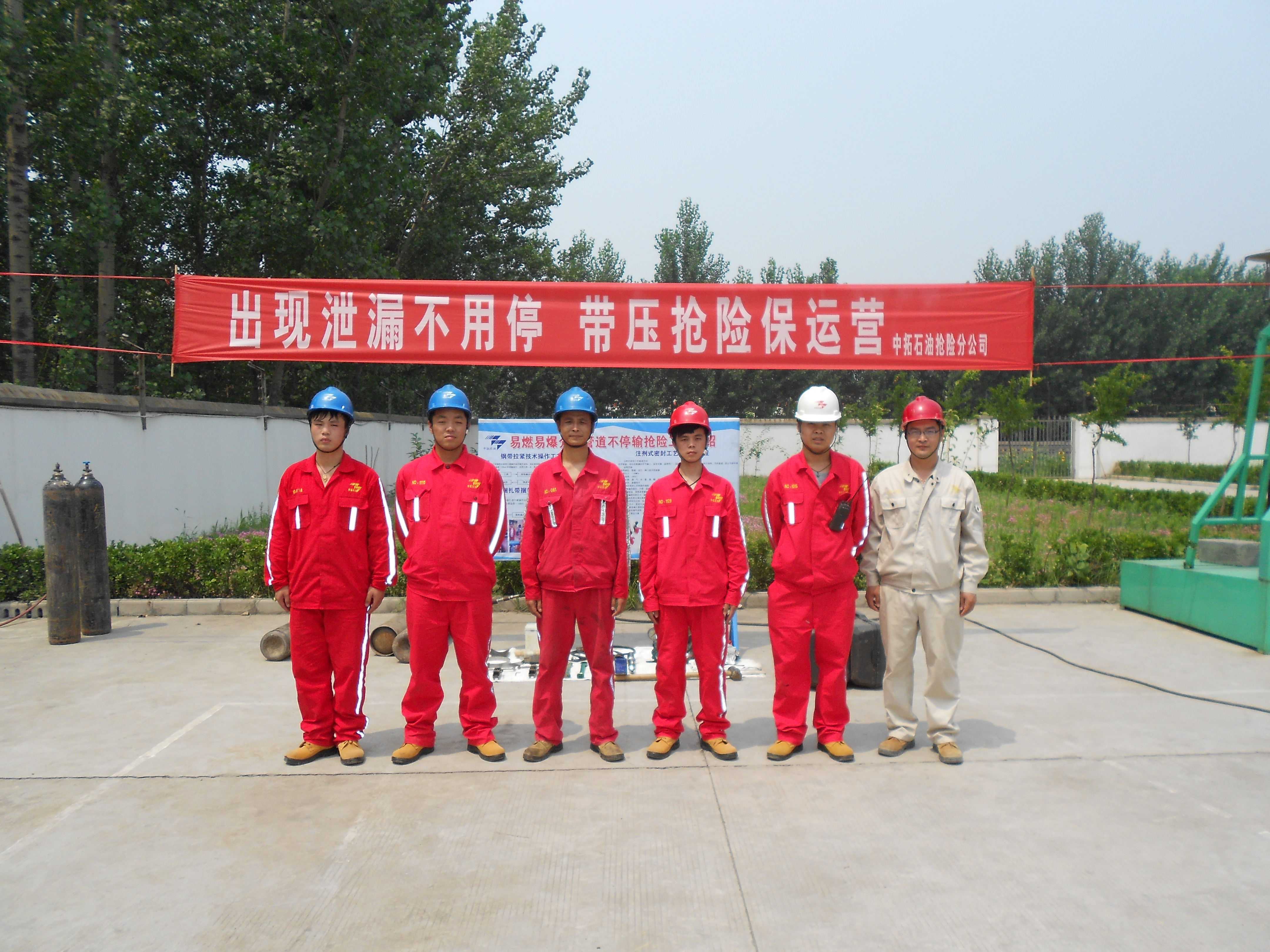 中拓?fù)岆U(xiǎn)人員到達(dá)事故現(xiàn)場(chǎng),立即實(shí)施搶險(xiǎn),設(shè)立風(fēng)向標(biāo)示標(biāo)志,警示標(biāo)志,啟動(dòng)強(qiáng)制通風(fēng)機(jī)。穿著防護(hù)服,佩戴正壓式呼吸器。實(shí)施可燃?xì)怏w濃度檢測(cè),使用專業(yè)防爆工具對(duì)天然氣泄漏點(diǎn)進(jìn)行注劑式密封作業(yè)。經(jīng)過57分鐘的帶壓搶險(xiǎn)圓滿的完成了此次模擬運(yùn)行壓力為4.0Mpa的燃?xì)夤艿佬孤c(diǎn)的搶險(xiǎn)任務(wù)。中拓石油專業(yè)化的搶險(xiǎn)技術(shù)和搶險(xiǎn)隊(duì)員熟練的操作技能,給現(xiàn)場(chǎng)參加演練的領(lǐng)導(dǎo)留下深刻的印象;并給予了很高的評(píng)價(jià),贊譽(yù)“中拓石油是一支能打硬仗的隊(duì)伍;為我們進(jìn)一步的合作奠定了堅(jiān)實(shí)的基礎(chǔ)”