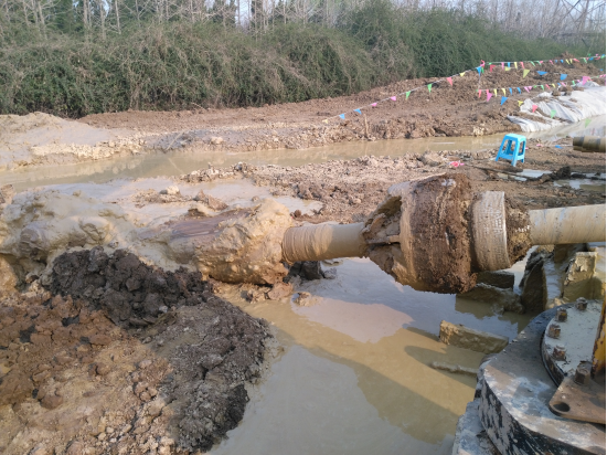 工程于2016年03月06日開始導(dǎo)向孔鉆進(jìn),施工中難點(diǎn)較多:穿越實(shí)際地質(zhì)比地勘巖石硬度大;在入土點(diǎn)場地內(nèi)有兩條無標(biāo)識(shí)軍用國防光纜;為了避開入土點(diǎn)的加油站和出土點(diǎn)的廠房,穿越曲線橫向偏移了39.4米,又增加了導(dǎo)向孔的難度。