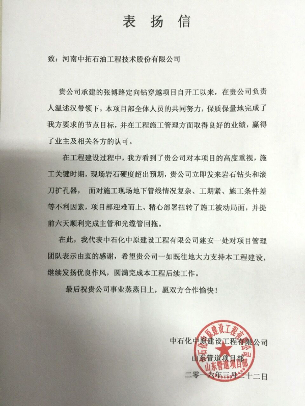 此工程在分公司經(jīng)理時(shí)德智、項(xiàng)目經(jīng)理賈永貞、總工程師李瑞山以及項(xiàng)目全組人員的共同努力下,克服重重困難,按時(shí)保質(zhì)的于2016年03月22日凌晨3:30回拖完成,僅歷時(shí)16天。得到了業(yè)主方與甲方的一致認(rèn)可和好評(píng),并給予我公司高度的贊揚(yáng)。