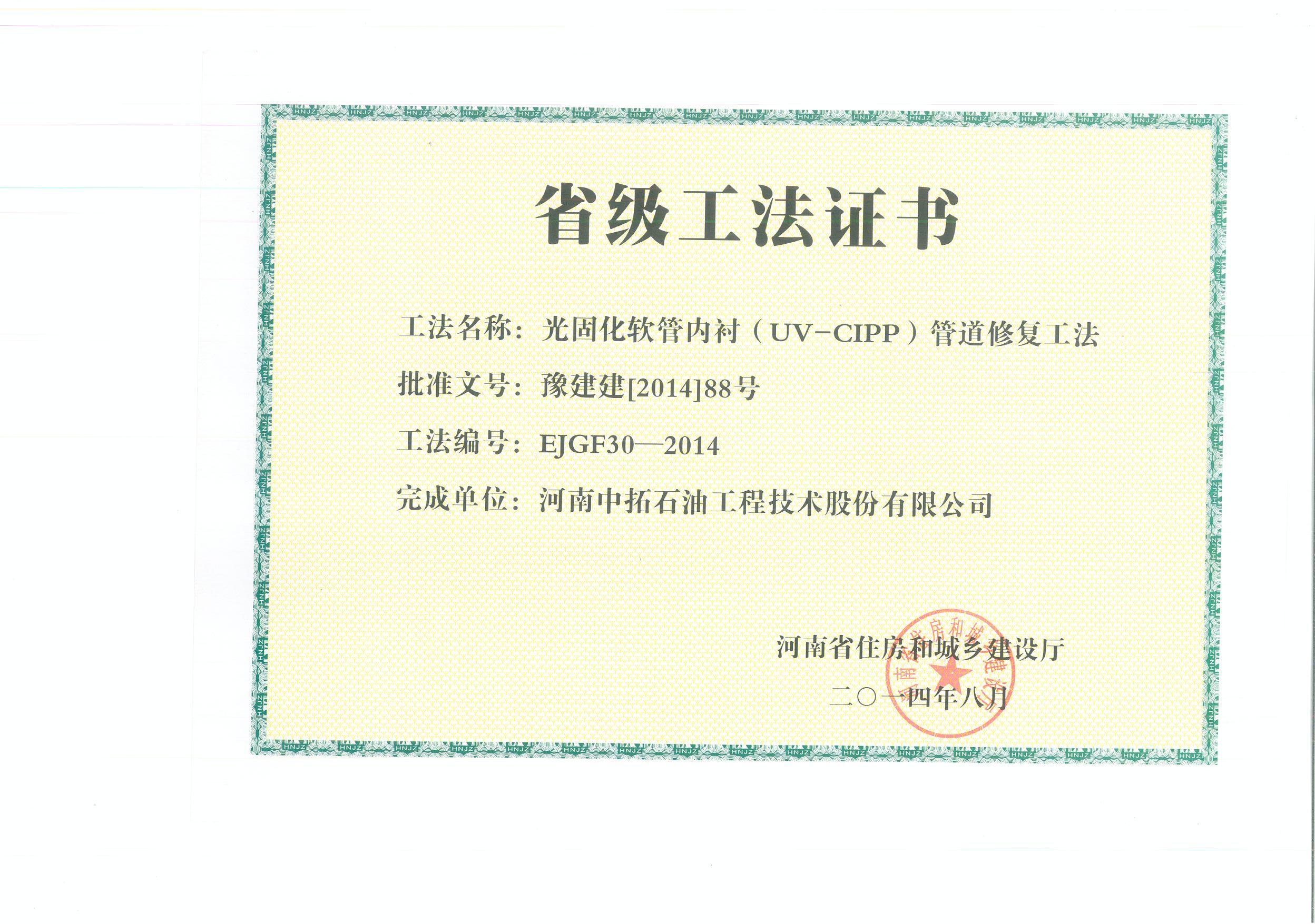 經(jīng)河南省住房和城鄉(xiāng)建設(shè)廳組織專家委員會(huì)評(píng)選、評(píng)委會(huì)審議并經(jīng)網(wǎng)上公示,我公司獲得一項(xiàng)河南省省級(jí)工法,工法名稱為“光固化軟管內(nèi)襯(UV-CIPP)管道修復(fù)工法”。上述工法的獲得,表明公司的科研成果得到了政府部門的充分肯定和認(rèn)可,展示了公司管道修復(fù)的科研實(shí)力,同時(shí)為今后繼續(xù)申報(bào)國家級(jí)工法做好準(zhǔn)備,為申報(bào)政府科研項(xiàng)目、科技品牌建設(shè)再添科研成果奠定基礎(chǔ)。